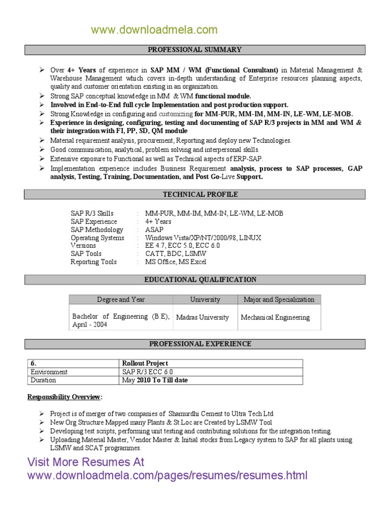 Sap Mm Consultant Resume. Provides knowledge of technical products or families of technologies on small to medium-sized projects typically involving single product or single computer environments, where design is non-complex, to ensure client business needs are met. Reviewing enterprise structure, benefits realization strategy, business process design documents and baseline configurations.